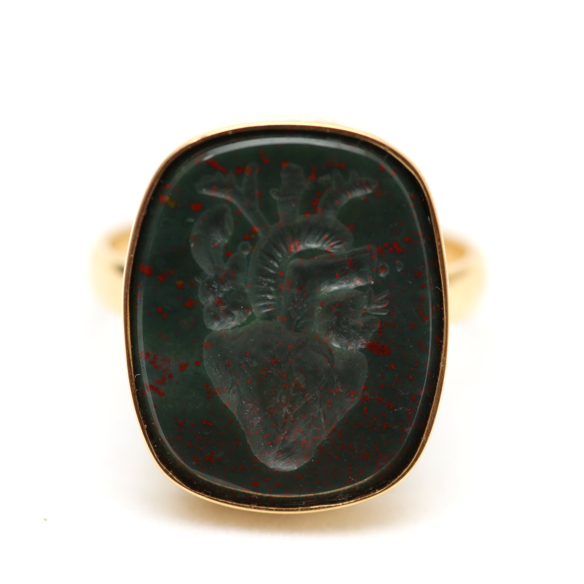I took a killer bloodstone heart intaglio and had a custom 14k yellow gold bezel setting made for it to turn it into a one of a kind ring. Ring face measures 5/8"x1/2", ring size 6.
