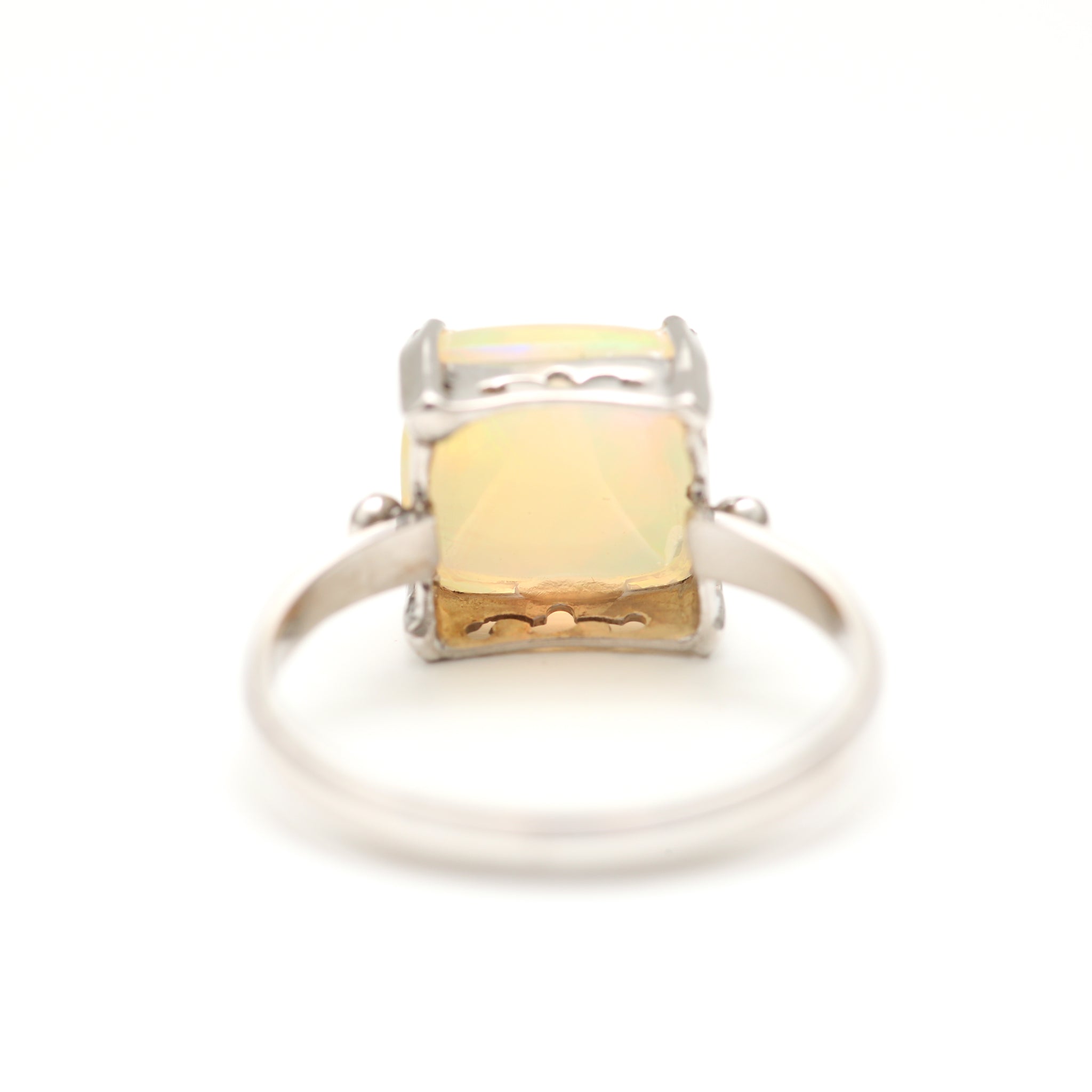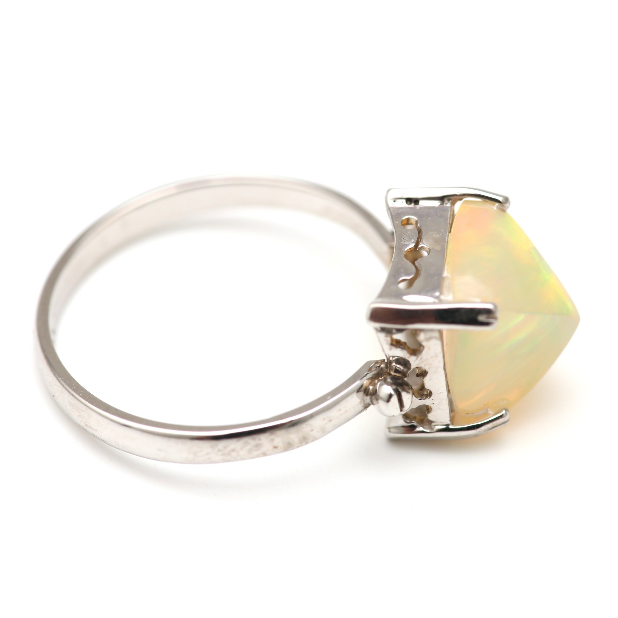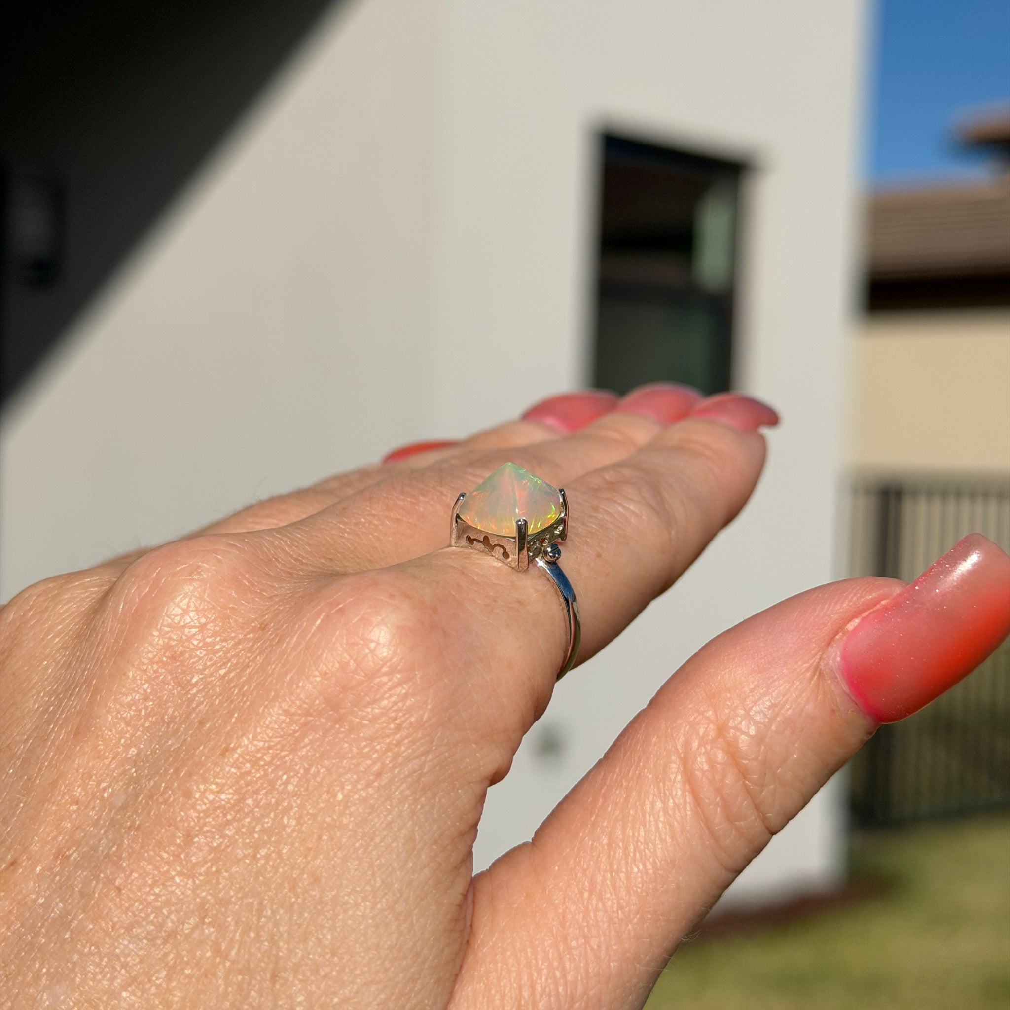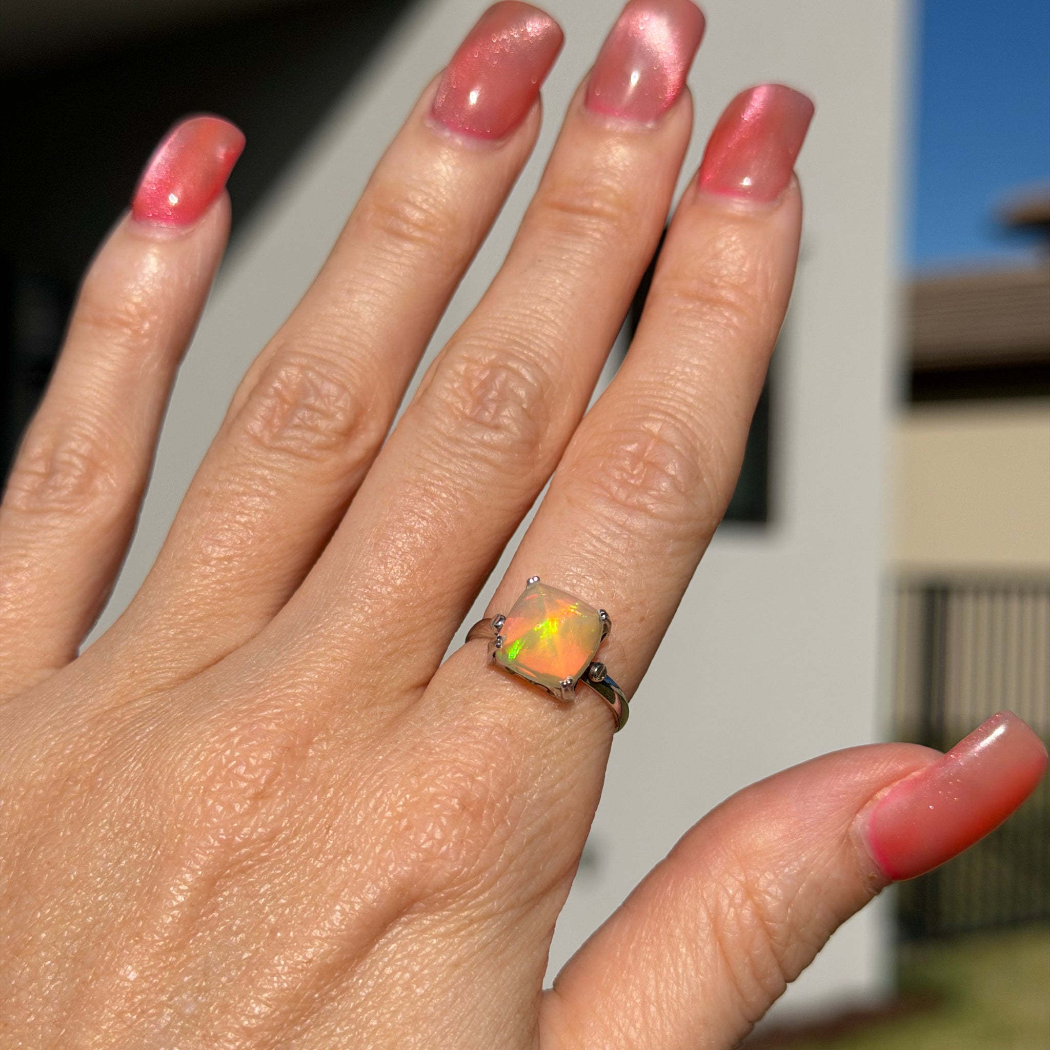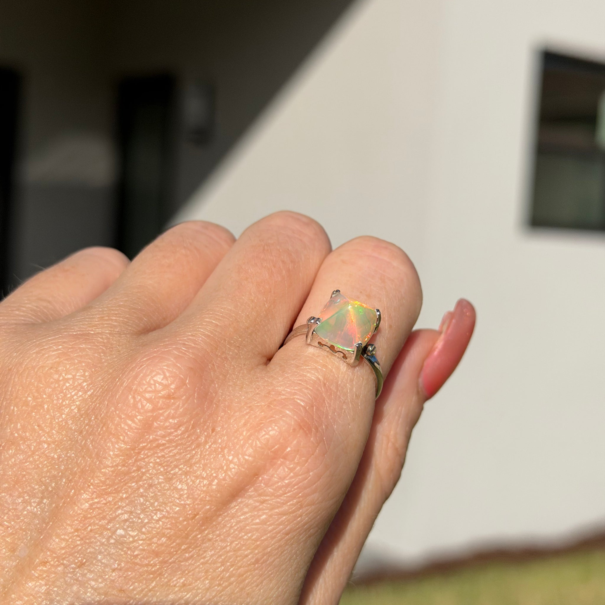 I found the absolute coolest sugarloaf cut Ethiopian opal and had to make it into a killer one of a kind ring. It's edgy and colorful and unique and set in 14k white gold. Opal measures 9.5mm x 9.5mm, ring size 6.