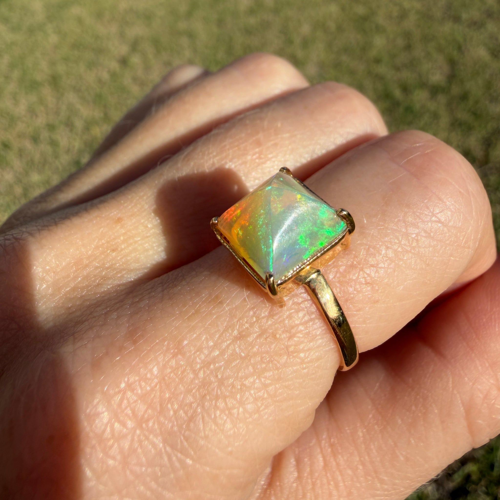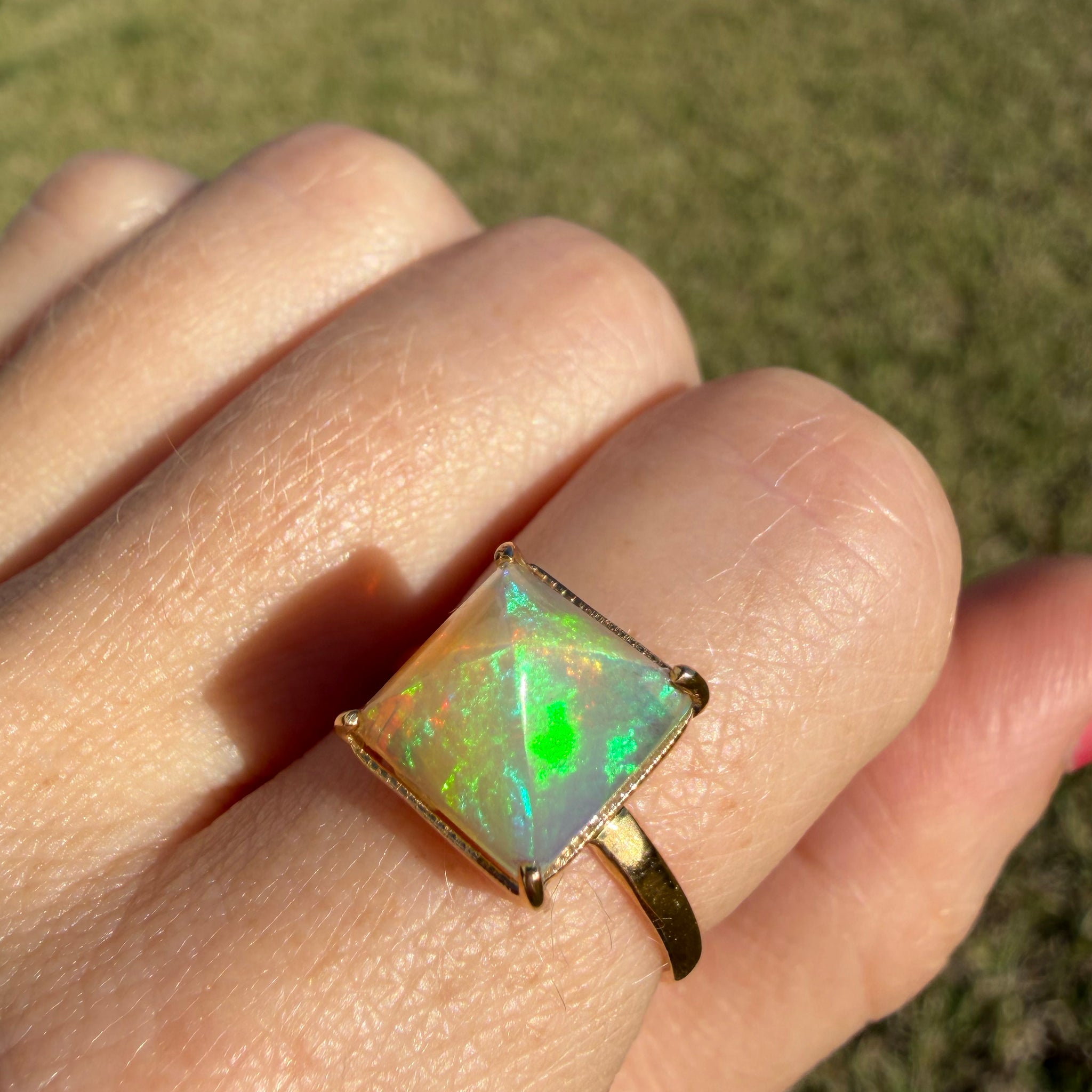 I found the absolute coolest sugarloaf cut Ethiopian opal and had to make it into a killer one of a kind ring. It's edgy and colorful and unique and set in 14k yellow gold. Opal measures 10.5mm x 10.5mm, ring size 6.
