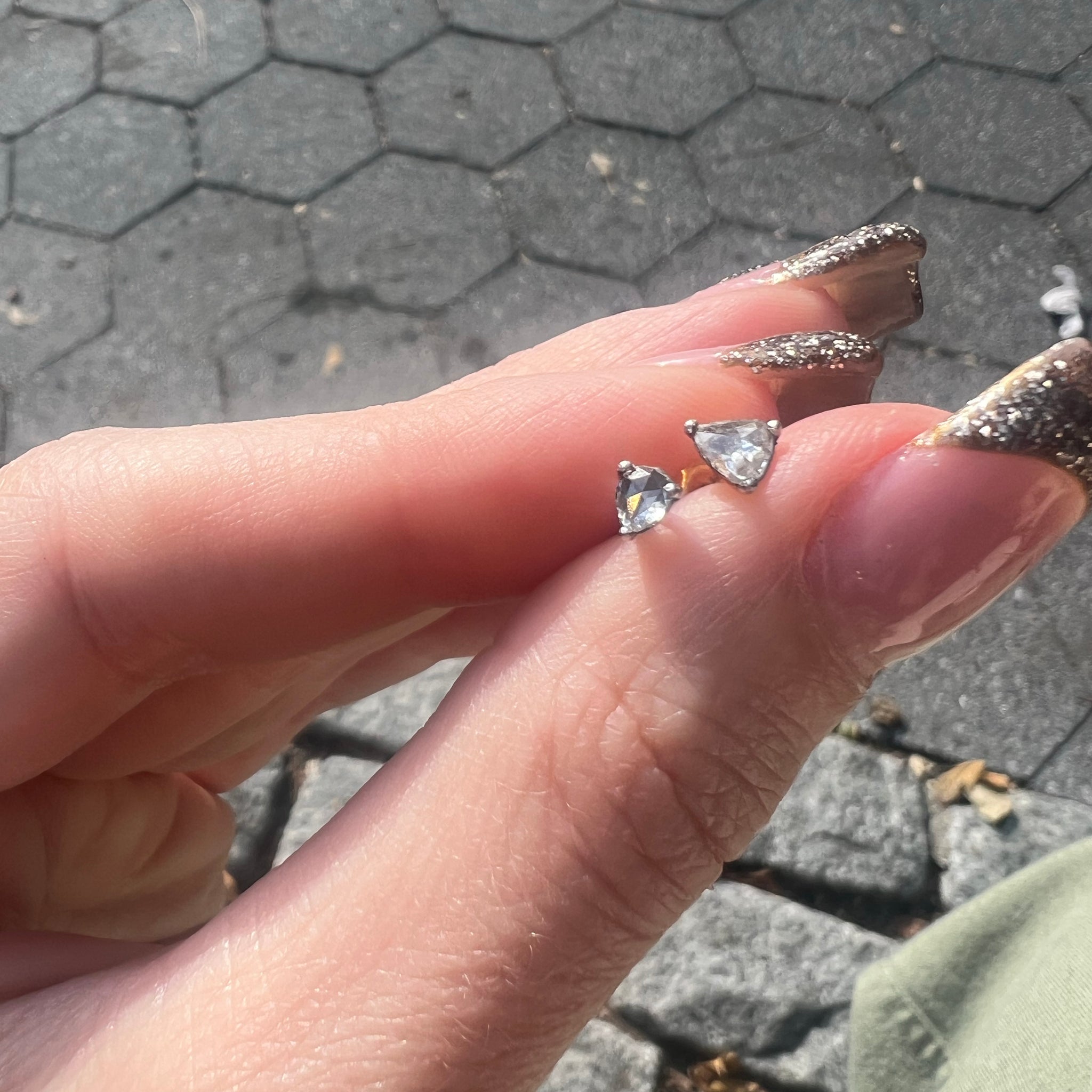 Edgy sparkly rose cut diamonds set in 14k yellow gold. The larger studs pictured measure 5mm (.5ct), the smaller studs measure 4.3mm (.3ct) in diameter. Comes with 14k butterfly backs.