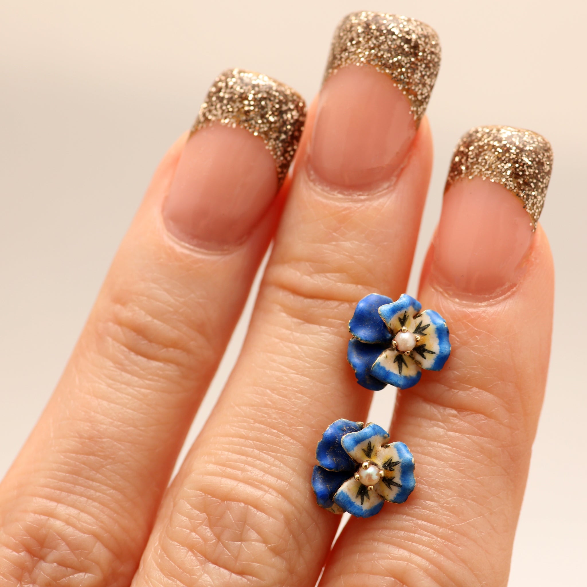 Beautiful 14k gold blue enamel pansy earrings. Each pansy measures 1cm in diameter. In excellent condition- please see photos for detail. Each has a tiny seed pearl center. For pierced ears.