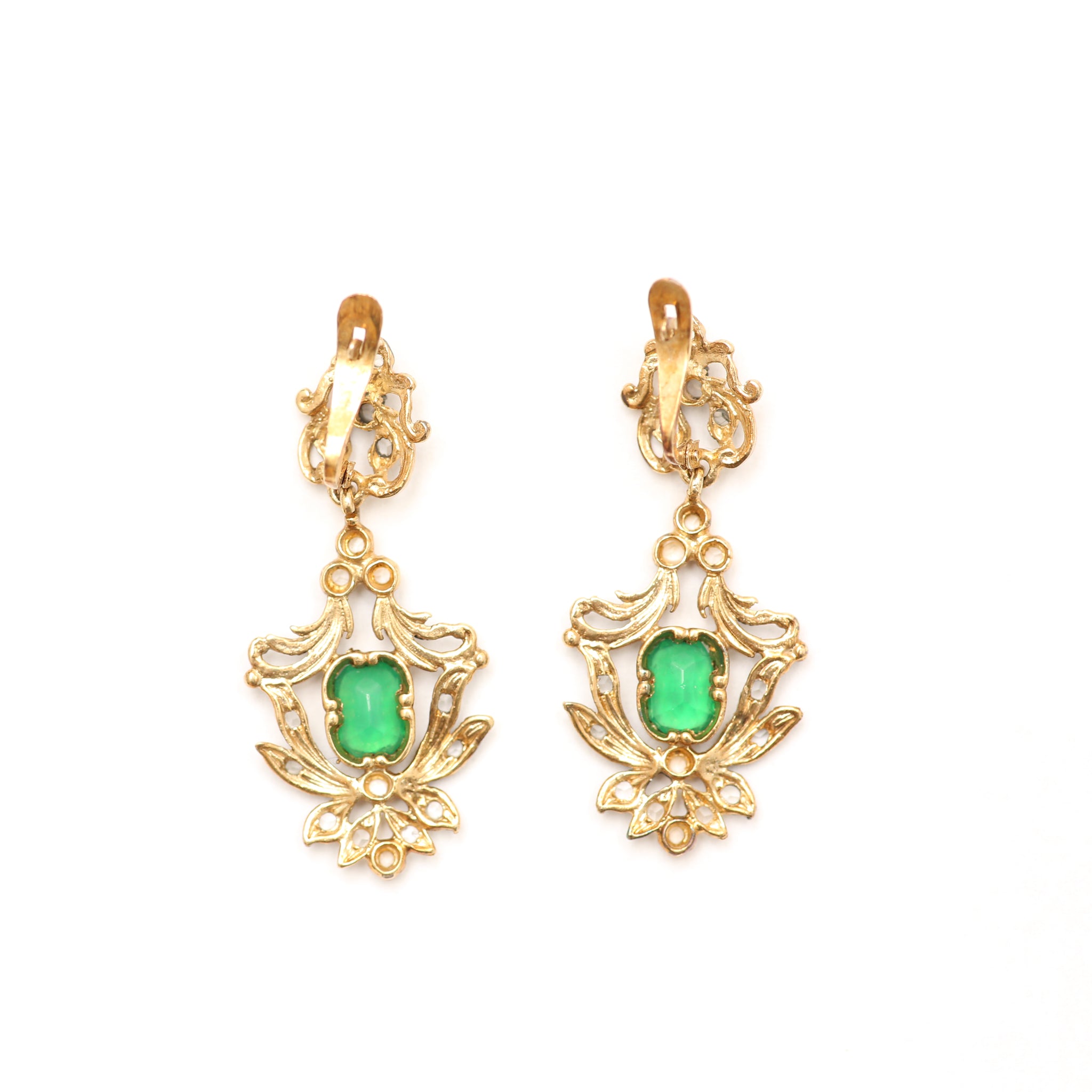 Mesmerizing antique emerald and rose cut diamond earrings. Metal is gold vermeil. Earrings measure 1.5" long.Matching emerald ring is also available for purchasehttps://www.totemkitten.com/collections/rings/products/emerald-rose-cut-diamond-ring