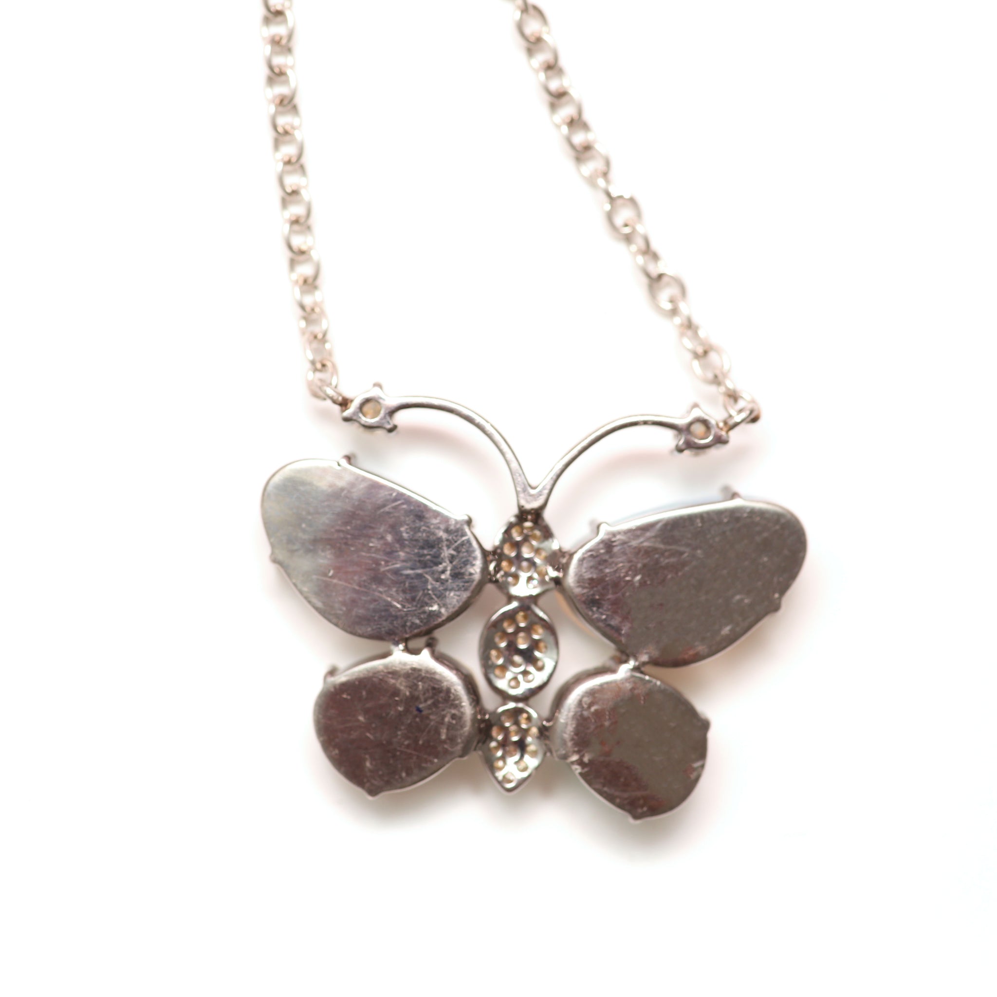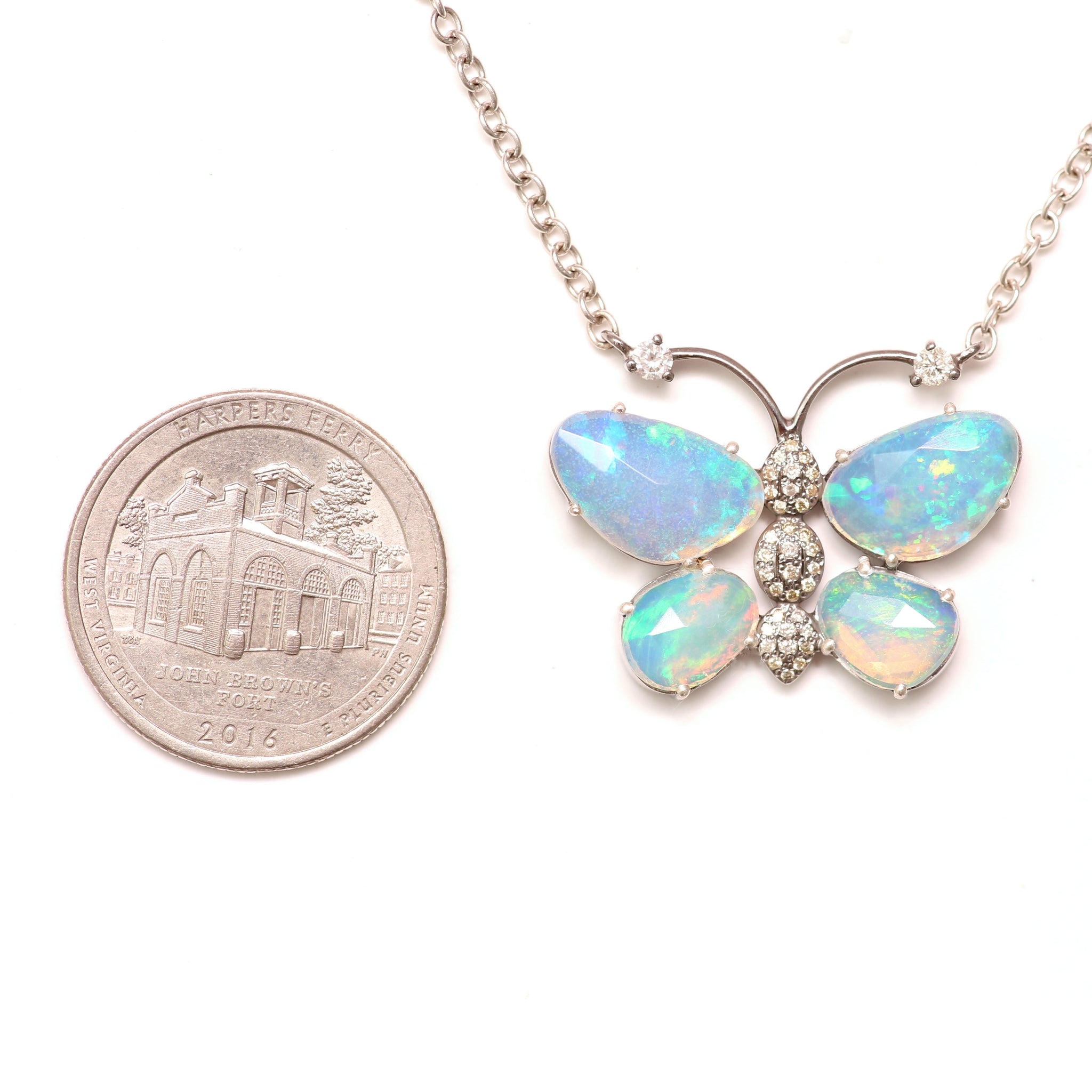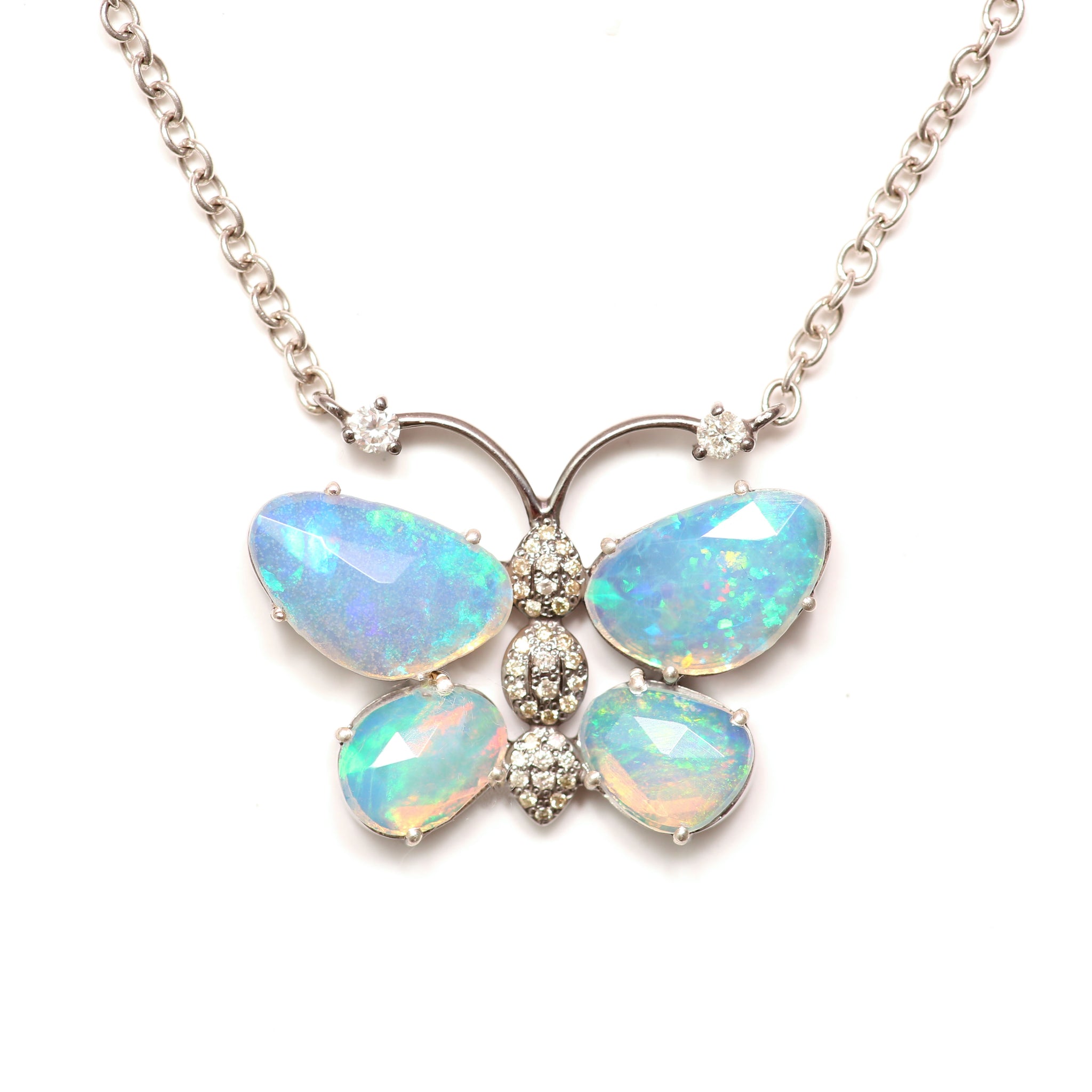 Stunning butterfly necklace crafted in sterling silver, featuring a diamond body and faceted African opal wings. Butterfly measures 1" x 1.25", necklace can be adjusted between 15"-18"