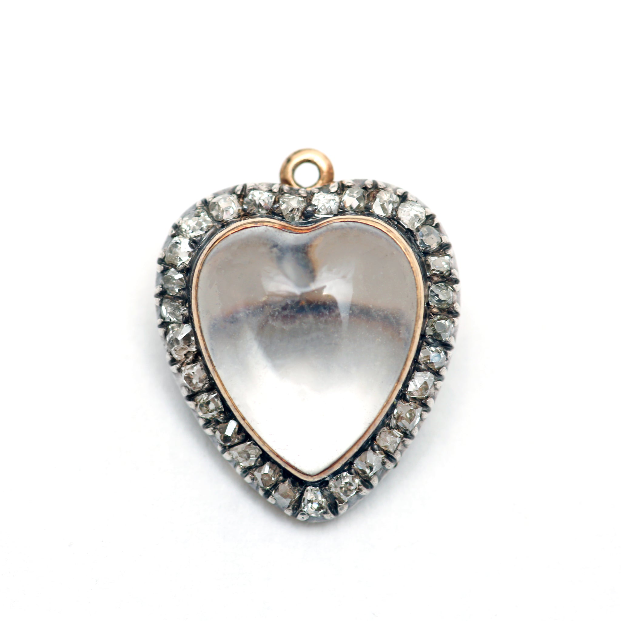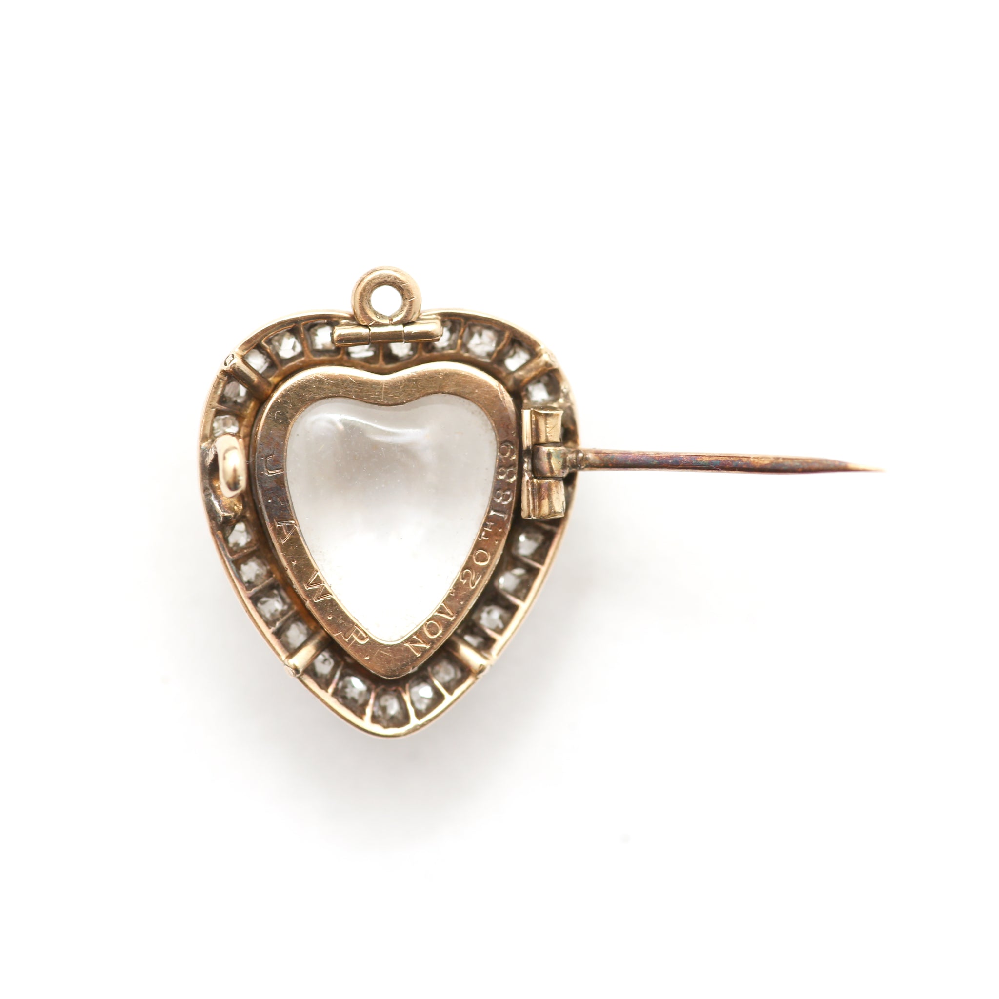Stunning antique rock crystal heart locket that can be worn as a pendant or brooch (pin can be removed upon request). Metal is 14k yellow gold topped in silver where the old mine cut diamonds are set. In really wonderful condition, everything is original. There is some engraving on the back from 1889! Locket measures approx. 19mmx17mm.