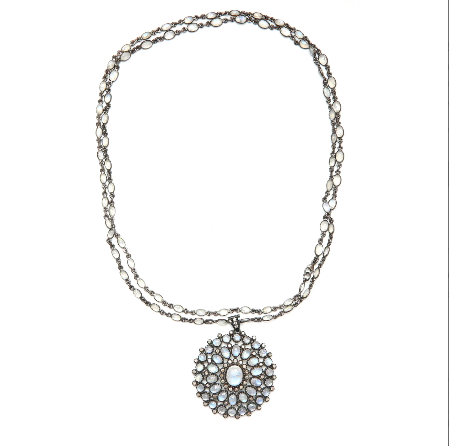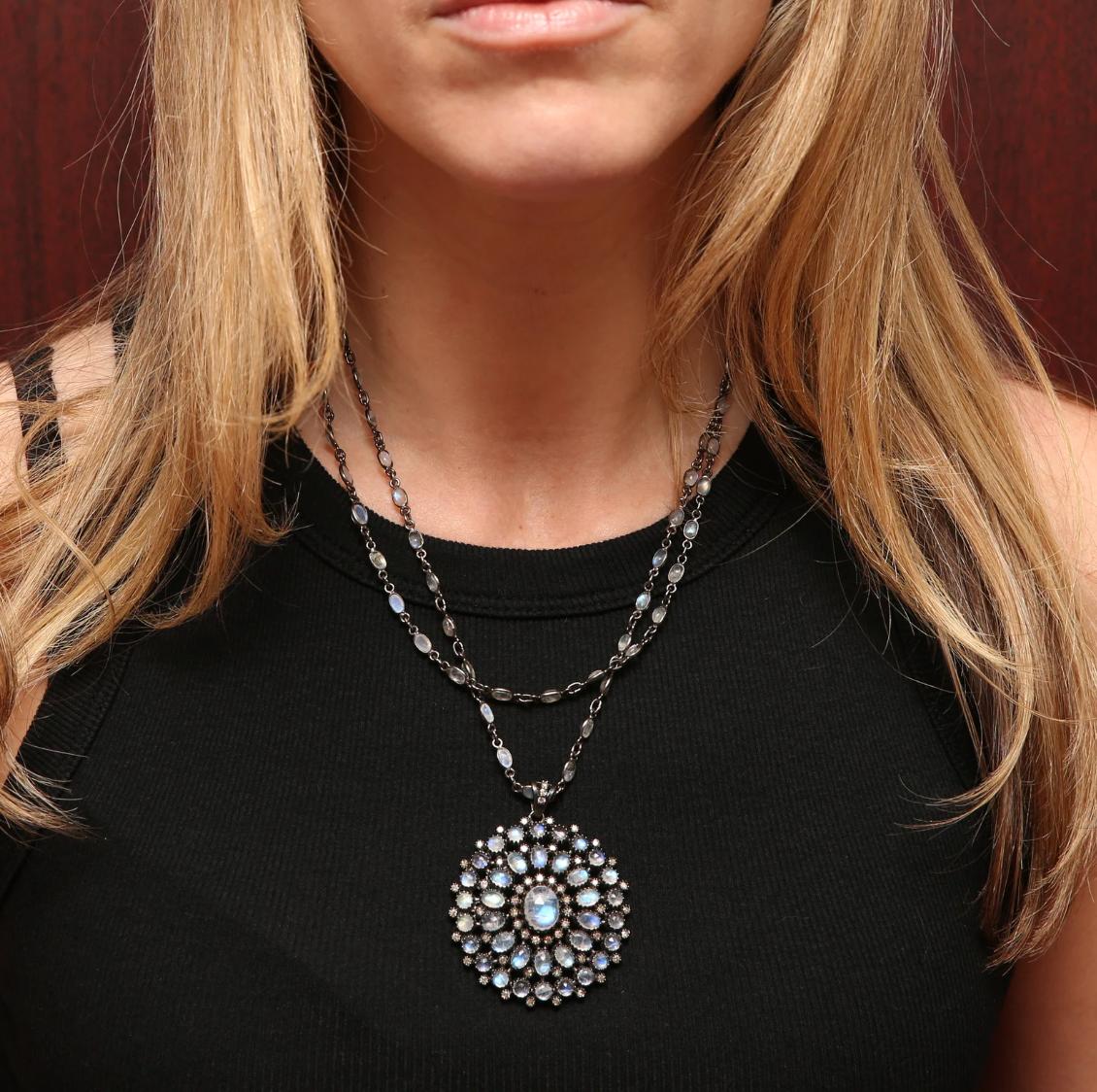 This necklace just glows with beauty. Faceted moonstone and diamond cluster set in blackened sterling silver with a chain to match. Pendant is 2.25" tall including the bail, the chain is 39" long, can be worn doubled into two layers.