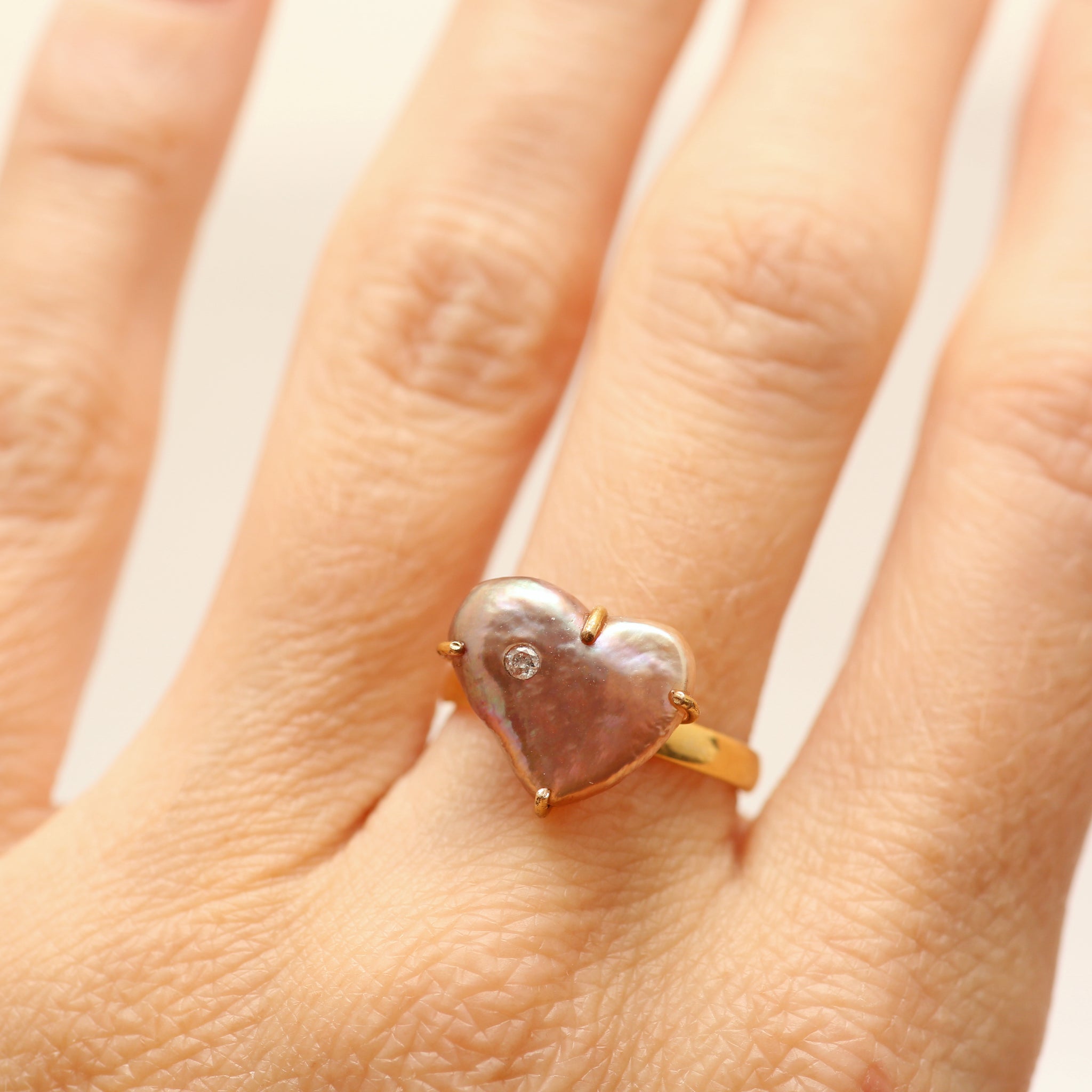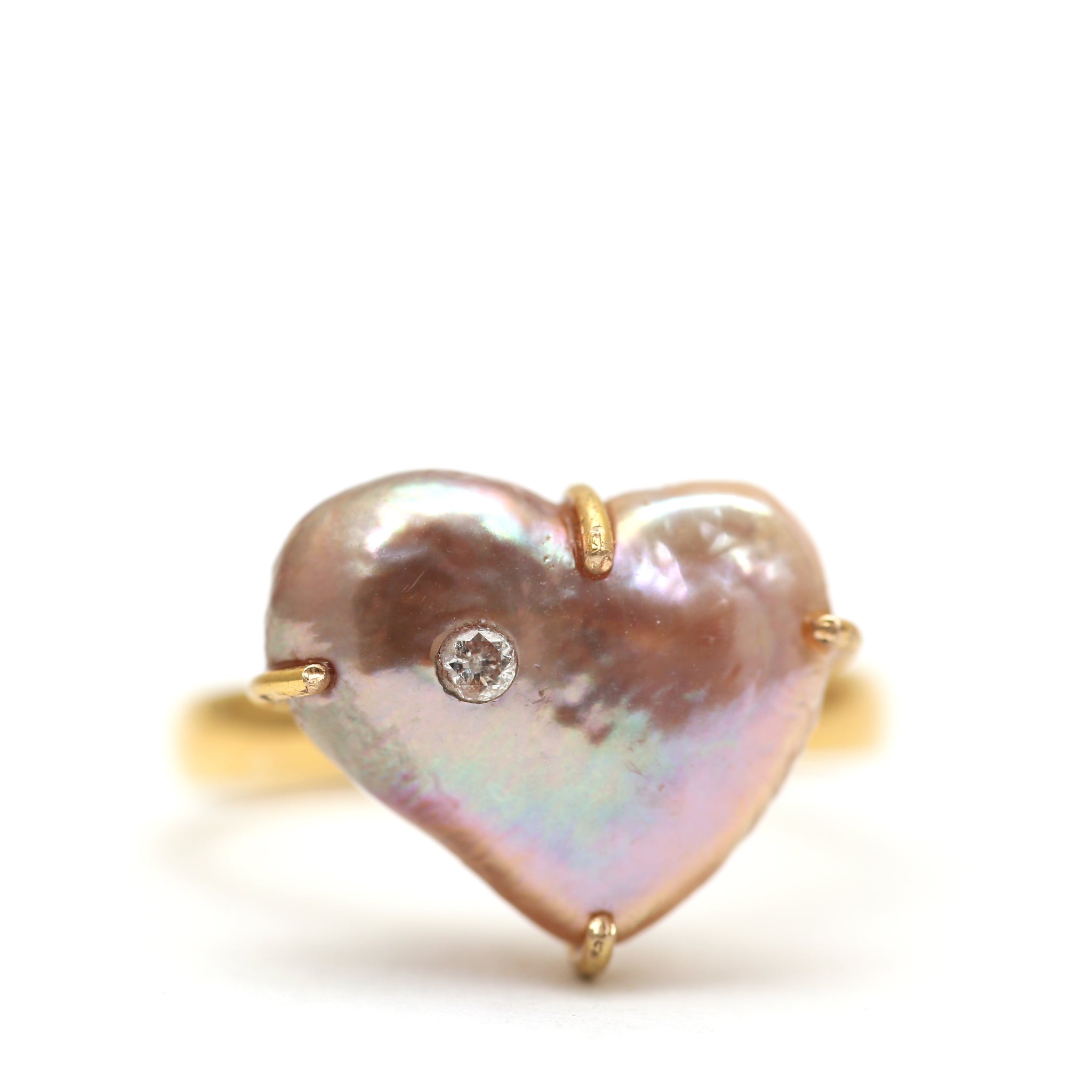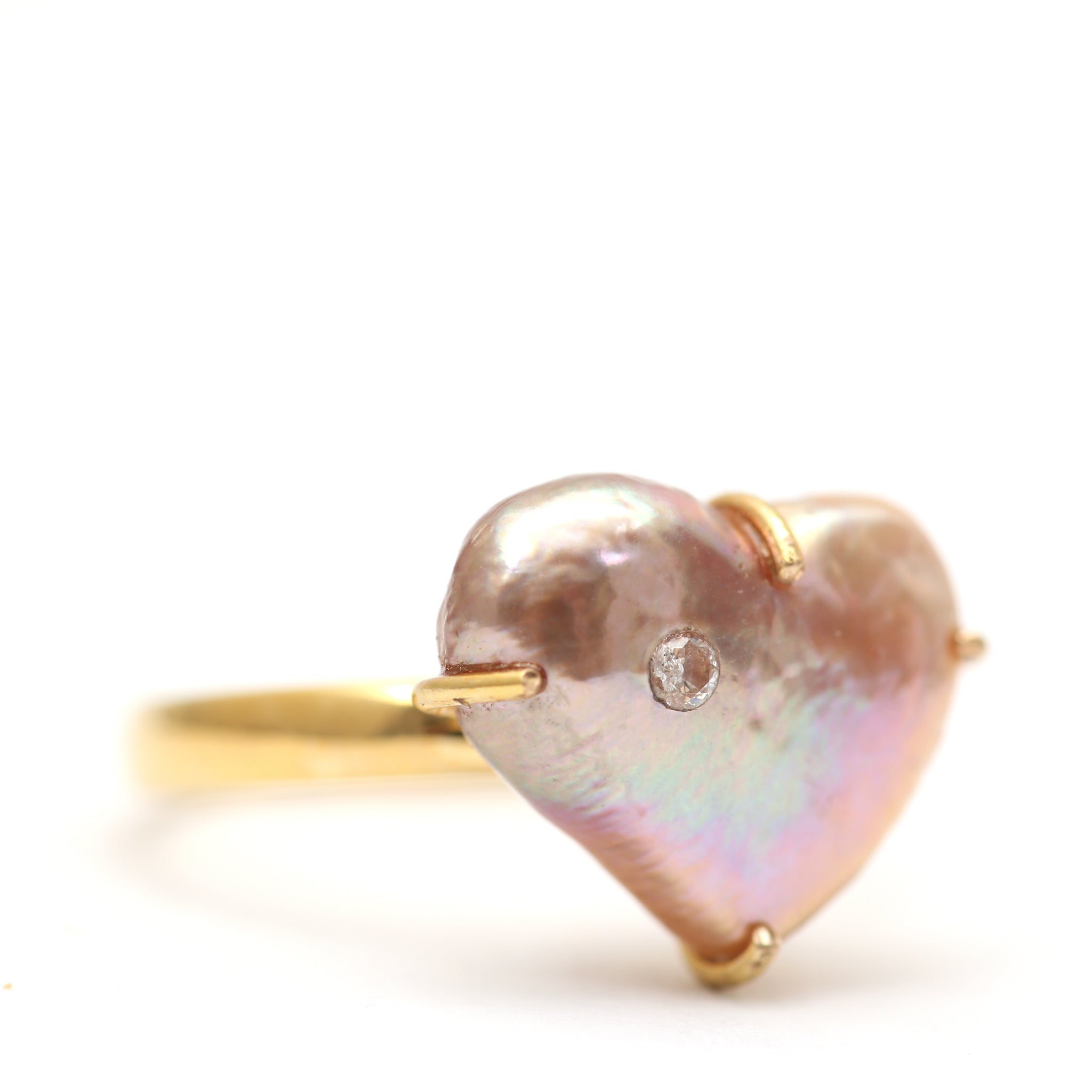 I took an adorable pink freshwater heart-shaped pearl and had a custom 14k yellow gold setting made for it and embedded a small diamond. Ring face measures 1/2" in diameter. Ring size 5.75.