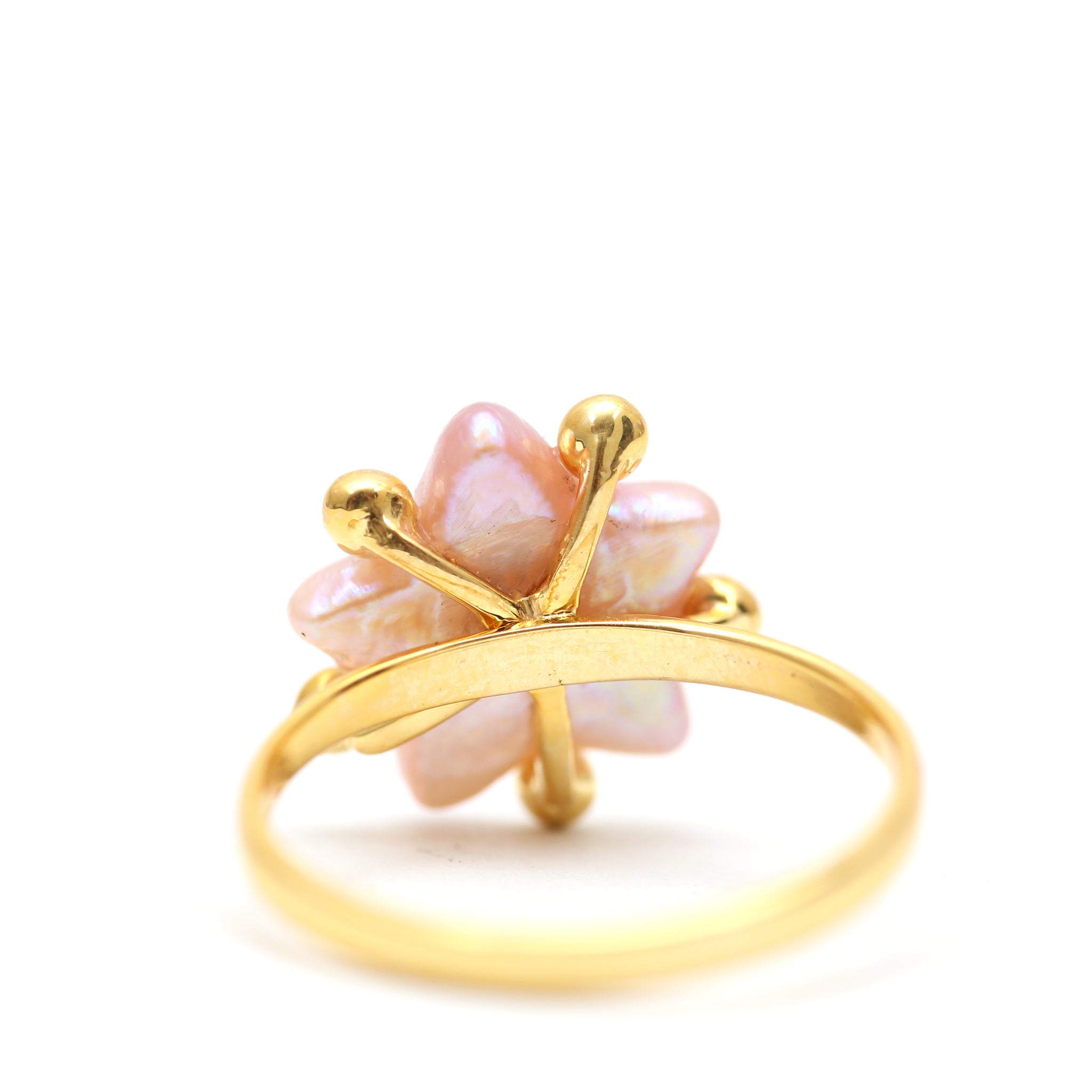 I took an adorable pink freshwater star-shaped pearl and had a custom 14k yellow gold setting made for it with five sparkling bezel-set diamonds. Ring face measures 1/2" in diameter. Ring size 6.