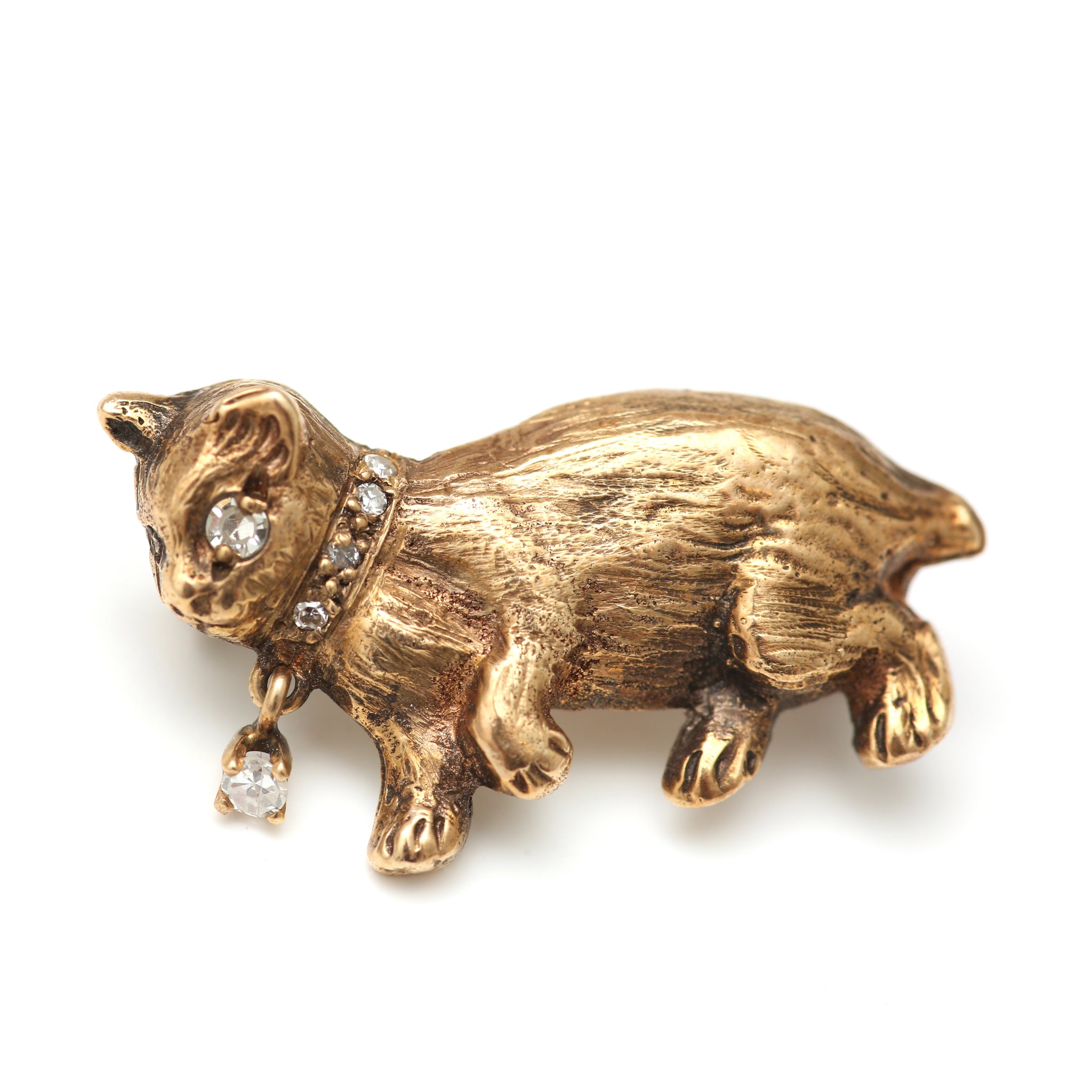 How could you not love this 14k yellow gold kitten with a diamond collar from the Victorian era?? Kitten measures 1/2 inch x a hair over 1 inch. Kitten is currently in brooch form, but can be converted into a pendant upon request for a fee. 5 grams.